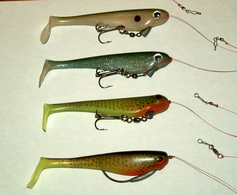 Location: Essexville, MI./Saginaw Bay. | Well, just finished pre-tying all of my new 5" Berkley Hollow Body Swimbaits, that I'll be trying this open water season as sliders above my Rattle Tot's. If they are not compatiable with them as sliders, I thought about using them on some lead core by themselves. Also just ordered 3 packs of the 4" to troll and/or cast on the river while fishing both day and night. I just could not resist their swimming and fish catching charm. Proven to me after watching 3 episodes of both (In-Fishermans) Doug Stangy and Al Linder (Angling Edge) catching some very impressive walleyes on them while casting, and I'm thinking rigging them for trolling just might be killer as well. So when the bare spoons or spoon harnesses start catching those little sub-legal walleyes around the last of June, I can hopefully switch over to these bigger offerings for some bigger gators.