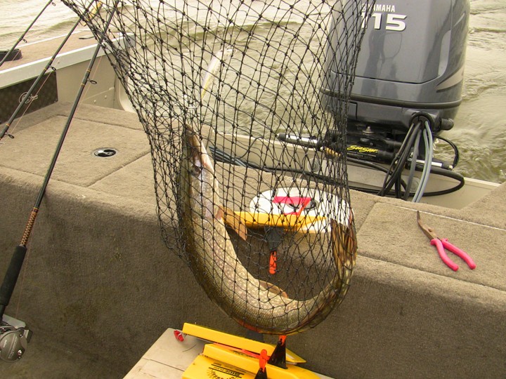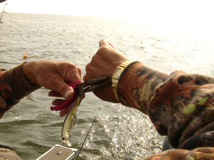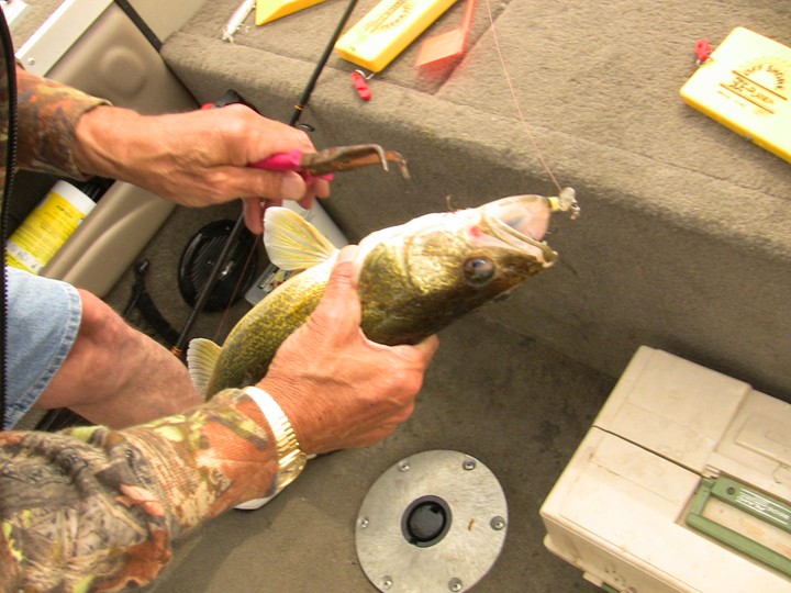 Now the bloodbath part of my subject title and something that proves just how much of a game hog the brother really is. Dave gets a rip, pulls in this 38 inch Gar Pike. While hoding the pike and trying to get the hooks out, the fish flips and rams yet another set of trebeles into and past the barbs, in the back of the brothers hand. While trying to cut the end of the hook off his other rod goes off with a fish. He then tells me to un-hook the line from the Bomber on his first rod, so he's not hindered by it, and can reel in the other fish he has on, before he even has the hook out of the back of his hand. He would not let me reel it in. He did so with one bomber burried in one hand, and risking yet more calamity and flesh damage, with the 2 reamining barbs flying around as he reeled and landed the other fish.