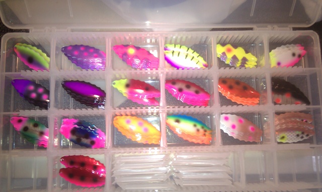 | I'm told they are painted by a guy in MN who is going to be offering his product in WI exclusively through Anglers Avenue. They also have custom Rebel Fastrac's, Rapala Shad Raps, and Rapala DT's in stock. I attached a photo of some of the Shad Raps they had and also a photo of the Yeck blades I bought on my visit.