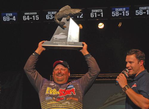 | Consistency. That's what wins more fishing tournaments than any one particular tactic. EverStart Pro, Dan Stier took home First Place Honors and a $70,000 check plus contingencies. He was quiet all week, managed to weigh 21-04 on Day One, 15-07 on Day Two, 13-11 on Day Three and 18-14 with four fish for a four day total of 69-04.