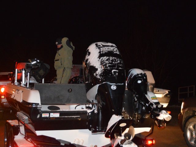 The snow arrived last night and continues now, with about a half inch sticking to the ground. All the boats were coated with ice and snow, but the field seemed eager to hit the river since it's still pretty much anyone's game to win.