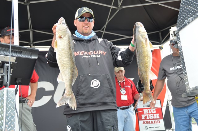 Location: Rhinelander | Lund/Mercury Pros Justin Kohn and Matt Nogalski lead the Merc National with 25.52. No details were disclosed, but a promise that if they do as well tomorrow they would 'give it up' was made during a WalleyeFIRST interview. Pat Kolbe and Brad Halbach are in second with 22.40, Tim Lynch and Scott Gray statistically tied but in third with 22.36, Glenn Curran and Tom Walters are in fourth with a close 22,24, and Todd Strook and Jason Strook round out the top 5 with 19.44. Limits were much harder to accomplish than last year, with about 25% of the field limiting.