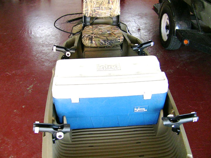 That is very true Viking. But I thought that part through (I think) ;-). After fabricating and mounting the raised oar and lock system, having the rod holders down where they were on the gunnel at first wasn't going to work anyways. I will more then likely be trolling via the electric motor on most occassions. And they are still mounted low enough (with the high seat) that casting, anchoring and quarter casting and/or virtical jigging is easily accomplished. The raised oar mounts are basically even mounted there for rowing comfort or in case the electric pukes out anyways, or I decide to row and drop back fish like I did for 15 years with my drift boat. In that case I would use the front holders (which are still in reach) to hold the rods and run the plugs ahead of the boat versus them being draged behind.
