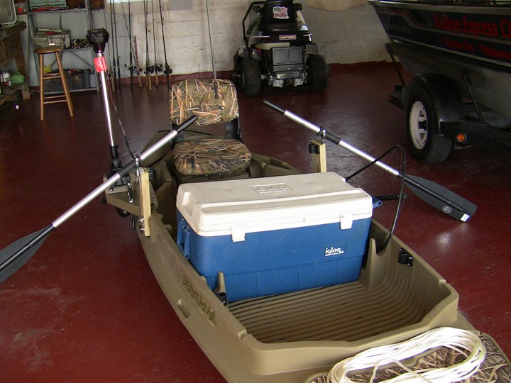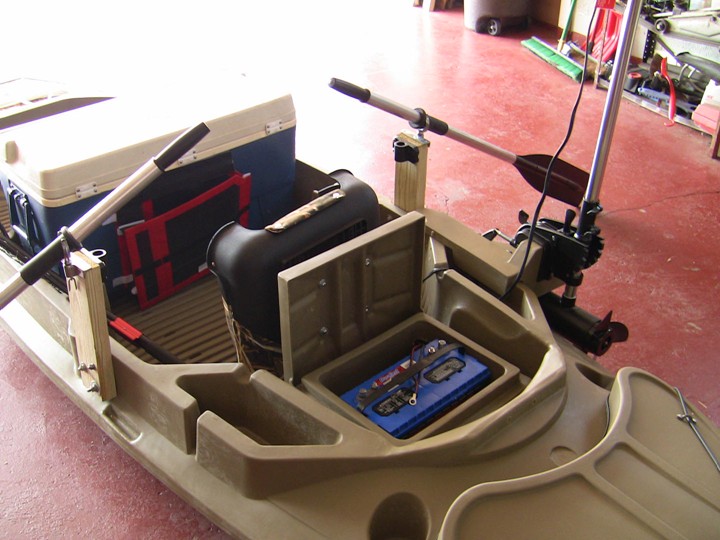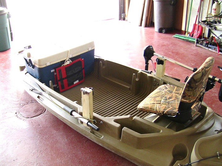 I've taken up kayak fishing this summer and I am hooked. I have a super basic set-up right now but plan to do a full conversion in the near future. That's a nice set up, Dan. The one problem I foresee is your rod holders and oar locks being on the same riser; you won't be able to row with lines in the water.