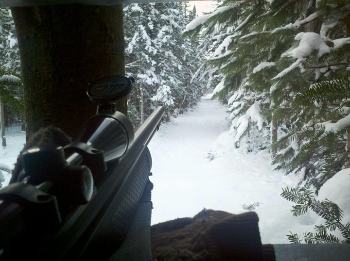 Got set up and was quietly watching the lanes by 2:00pm. Nothing is as quiet or as beautiful as a thick Cedar Swamp in heavy snow. I dosed off a few times in the blind but right around 4:40pm I opened my eyes just long enough to see a big deer jump the lane. Then 2 smaller ones came out and crossed the lane slowly. I could have shot either one, as by now my food enduced stuper was gone and I was watching things through the scope. Then I seen a BIG Doe just stick her head and neck out on the left side of the lane. I took a picture of her with my cell phone, as she just stood there it seemed like forever. You can barley make her out in the photo. When she finally came out in full view, she was probably 180 yards down the lane. Down went the cell phone and back behind the scope.
