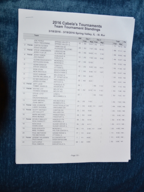 1- Joe Perrez & Troy Tregoning 19.12 lbs 2- Curtis Olivier & Doug Galant 17.11 3- Steve Vandemark & Jerry Fox JR 16.0 4- Jerry Eiben Joe Knight 12.07 5- Glenn Daugherity & Kathleen Hohn 12.02 6- Adam Sandor & Steve Sandor 11.04 7- Ron Levin & Nick Ingoglia 10.07 8- Dave Ahmann & Wayne Millman JR 9.03 9- Ed Michniewicz & Jasen Shine 8.01 10- Jeff Lahr & Tommy Skarlis 7.13