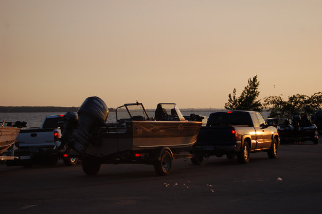 | Sunshine and brisk winds 15 yo 25 mph out of the southwest/west with temps in the 40's greeted the Pros as they launched this morning. Temps were brisk, but forecast to hit 70's today. Most of the Pros I spoke with had no idea what the weather yesterday did to their patterns, but felt reasonably confident the fish would be there and ready to go.