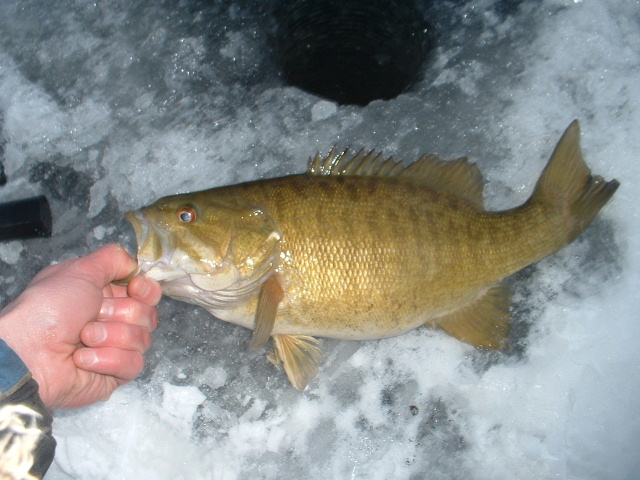 Hit 'em hard again this morning, they were really active in the snow. Six smallies on the ice and lost several more jigging. Had a few tip-ups run too, most hit and ran but I did break one nice one off trying to horse it in. They weren't running quite as large as perivously, but I did manage one 17". The lawyers are VERY active - as much as I tried to avoid them, I iced 5 or 6 of teh slimy SOBs.