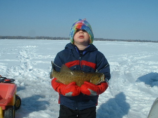 Headed back to the same spot for the fourth weekend in a row - I may have gone to the well one time to often. This week: 2 marks, 2 hits, 1 - 13" fish on the ice. Sounds like the eyes and the perch are pickin' up so I'll probably turn my attention back in that direction.