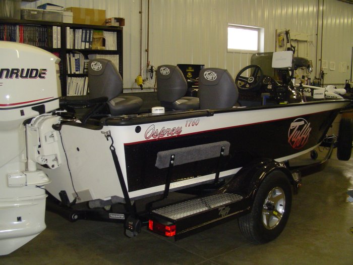 Take a look at this 2008 1760 OspreyGC we recently rigged at Holmen Marine. We went with a retro white look and used a white E-Tec 150 and white Riptide 80# Minnkota. We also added the new Lowrance to BRP I-Command system and networked all the guages and locators. With this system you can now have digital water pressure, barametric pressure, oil tank level readings, trim position, hours used, fuel management calculations, engine alarms, as well as a host of other important data. This info can also be displayed on the two lowrance graphs right at your fingertips. It has lots of other add ons as well and should really scoot. If you are techno junky this is the boat for you. Check out more on this boat in the non-current boats listings at www.holmenmarine.com or email me at [email protected] and I can send you more photos and information.