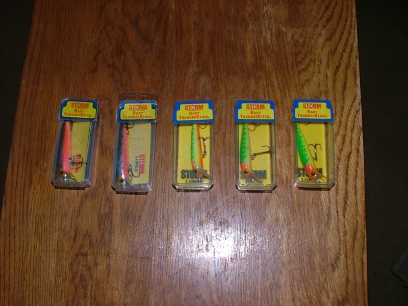 Lot #1: 5 new in box original Baby Thundersticks. Two are XJ-139 metallic rainbow trout and 3 are xj-214 red hot tiger. $60 firm. Price includes shipping to Continental US only.
