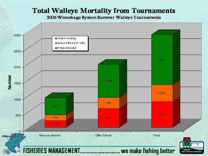 Member Posts: 794 Location: Elgin, Illinois | Tyee, In all fairness... That chart is almost worthless. Carefully look at the middle, orange, number... "ASSUMED" is the word used. I have yet to see a valid scientific tournament mortality study (and I really wish that there was one out there). The Wisconsin DNR tournamment study was seriously flawed and contained "assumed" results. You cannot have an assumption as a major part of your scientific argument. No matter who publishes it. I would love to have two five pounders in my live well and then "assume" I would catch three 12lbers and therefore have a total weight of 46lbs recorded for my "score"... Also, the DNR has carefully studied Winnebago and has concluded that tournament (mortality/and non-mortality) fishing has no harmful effect on the population...just ask them. "Exploitation" (removed from all sources) is factored into the management equation every year. And, every year in the last 15-20 years (don't have the exact dates in front of me) they declare the population of walleye in the system to be healthy. Edited by hgmeyer 3/3/2010 7:41 PM | ||
