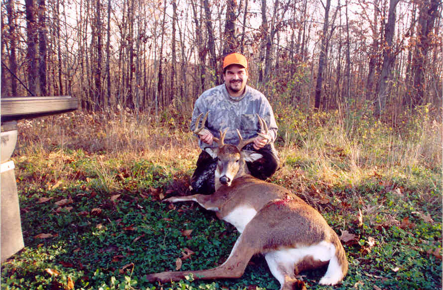 Member Posts: 39 Location: NE/IL | I can sympathize with you! I spent 9 days bow hunting and then 3 more shotgun hunting before I finally got this 9pt.(20" inside) I passed on several 8pts that were just not wider than the ears but was getting frustrated. I'd seen several deer that I'd have taken but they were just out of bow range, and knowing what kind of deer were on the property I'd made up my mind I wasn't going to take a lesser animal. This buck isn't very tall but he's a really nice 2.5yr old. My friend Ron took a nice 8pt 2.5 yr old the next day. His is only 17" wide but tall. Actually saw a buck twice that would have made B&C. Once with the bow at 55yds. After he walked away I shook for 20 minutes. My buddy saw him the last morning of shotgun and stammered to me when we saw it. He's got 9 P&Y on the wall and a few B&C and he said it was the biggest deer he'd seen in 10 yrs. He doesn't get the fever but this deer un-nerved him too. Oh well, back down after Christmas to try some more. Jim Edited by eyeman_1 12/7/2003 8:20 AM Attachments ---------------- Jim1.jpg (103KB - 93 downloads) Ron3.jpg (65KB - 95 downloads) Ron1.jpg (54KB - 105 downloads) | ||