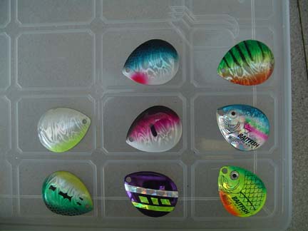 Member Posts: 885 | Dave, Just a few of my own thoughts on crawler harnesses on the bay... I spend quite a bit of time where you mentioned you are going to fish. On the bay I use a #2/0 Owner SSW with CUTTING POINT hooks. They are razor sharp and I have not lost a fish on a solid bite in the last 2 years. My basic setup is a 5 foot leader in 20# Vanish with a barrel swivel to reduce twist. I like the larger diameter line because it prevents linetwist in your harness when the nightcrawler comes off the second hook and starts to spin. For beads, I use 6 below the blade and 1 above to catch any small weeds, 6mm clear plastic beads. I use 2 single hooks per harness with 3 inches between the hooks. I attached a pick of the colors that produced lots of fish for me last year. I will vary my bead and blade color, but I will always run a firetiger Northland Baitfish and a Purple of some kind every trip. I run #5 Colorado blades with plastic quick change clevises. Northland blades are avaliable everywhere, I also get a lot of stuff from Doit corp. online. Sportsmans in DePere has a great selection of everything you need. As for learning how to tie, buy a harness tool, read the instructions and start tieing. It's easy to do Dominic Edited by Purple Skeeter 3/11/2007 2:11 PM Attachments ---------------- DSC00300.JPG (49KB - 462 downloads) DSC00301.JPG (34KB - 368 downloads) DSC00305.JPG (26KB - 342 downloads) | ||