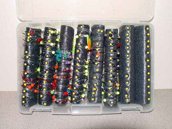 Member Posts: 885 | Here's a great way to Store 100 Crawler Harnesses in a Plano #26330 Box. Take pipe insulation and cut into 6 " pieces. Cut Plexiglass into strips 6" x 1 & 3/4" wide. Smooth edges of Plexiglass and round corners to avoid tearing insulation while inserting. Wet both pieces while inserting Plexiglass. Use a 2" stick pin on top edge to secure harness end. (hooks on other end). The flat harness holder is durable and handy and each will store 12 large harnesses. I've used mine for 4 seasons and they work great. I wanted a way I could keep 100 harnesses for each body of water I fish in one box. Purple Skeeter Edited by Purple Skeeter 2/2/2009 10:22 PM Attachments ---------------- harness1.jpg (106KB - 462 downloads) harness2.jpg (141KB - 943 downloads) | ||