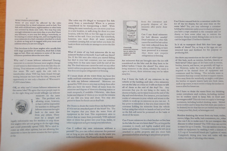 | Here is a fresh article from about ice angling and VHS from the WIDNR. Ice anglers adjusting to VHS rules Strategies to comply but still fish with minnows and dead bait MADISON – Buy only the minnows you need to fish that day or leave the bulk of them in a container in your vehicle in the parking lot or another location away from the water, bank or shore and return to the vehicle to resupply if the fishing action heats up. These are some of the strategies that Wisconsin ice anglers are using this winter to comply with new emergency rules aimed at preventing the spread of a new fish disease, viral hemorrhagic septicemia, or VHS for short, according to Conservation Warden Tom Van Haren, policy officer for the Wisconsin Department of Natural Resources. “People are starting to figure out ways to deal with the new rules,” he says. “Their minds are starting to click: if I can’t do what I have always done in the past, what can I do? “Some of these strategies can save a few trips back to the bait store when the fish are biting good, and not require you to drain the water from all the minnows you purchased when the fishing is slow.” VHS spreads fish to fish, or when infected fish or infected water are transported by people to a new water, so the emergency rules prohibit anglers from taking away water or live fish, including bait fish, from the shore or bank of any lake or river in Wisconsin. The emergency rules also limit the use of dead fish as bait, which can harbor the VHS virus. Dead fish can be used as bait only on the water it originated from, or on Lake Michigan or Green Bay, (waters where VHS has already been found) or if the bait was preserved by means that do not require refrigeration or freezing. Here are other strategies for fishing with minnows or other bait fish that comply with the rules: Waterfront property owners or those staying at accommodations with shoreline frontage can keep their minnows in a bait container attached to a dock or boat on that waterbody, with their name and address clearly marked on the container when left unattended. As long as the minnows are not being transported away from the water, bank or shore they may be kept live for later use on that waterbody. This option will not always be available in winter when the waters are covered with ice. Ice anglers can submerge a bait container under the ice of a permanent ice shanty and can then use those minnows at a later date on that waterbody. Remember, however, that ice fishing holes can be no more than 12 inches in diameter or square. Anglers who don’t use the previous strategies and who have leftover minnows must drain all water out of all containers, including those holding their minnows, before they leave the bank or shore and may not attempt to revive the fish later. If there is a trash can at the boat landing or access point, they may be able to dispose of the minnows there. Otherwise, they can take the minnows home and dispose of them in the trash or compost them or use them in a garden. Another option: water-free, dead minnows can be taken home and chemically treated and then used at a later date. Anglers can still trap their own minnows for use as bait, but may not transport any such live minnows away from the water where caught. All minnow traps must bear the owner’s name and address and must be checked and the contents removed at least once every 48 hours. The possession limit for minnows is 600 unless you are a licensed bait dealer. Bait dealers can apply for a wild bait harvesters permit, which allows them to transport live minnows away from a water body. However, anglers tempted by this option should understand that they will need to file paperwork describing exactly where and when they will be harvesting to get the permit, keep records of where the bait ends up, and have a qualified veterinarian perform a health inspection of the minnows before any of them can be used. No minnows possessed by fishing with hook and line equipment may be transported away from the water where used live. A brochure that answers more of the questions anglers have asked about the new rules is now available online. http://dnr.wi.gov/fish/documents/vhs_baitanglers1107legal.pdf VHS is not a threat to people or pets but it’s a significant health fish health disease and can cause fish to bleed to death. VHS has demonstrated in other countries and Great Lakes states the potential to cause large fish kills, long-term reductions in wild fish populations, and severe economic impacts. FOR MORE INFORMATION CONTACT: Tom Van Haren (608) 266-3244 | |||