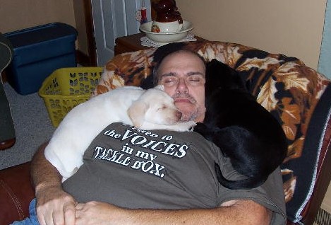 The wife just sent me a picture (I didn't know she took) of me yesterday and 2 of the Pups. I was tired after the big Turkey Dinner, along with being bored watching the Lions get back into their usual mid season form. Went out and grabed a couple of neck warmers and settled in. These 2 love muffins will be heading to their new home tomorrow morning, which only leaves 1 puppy left out of the 12 we started out with looking for a new home.