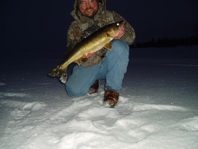 Released my first decent sized walleye of the winter, tonight. A nice 27 incher. Marked a good number of fish, but all seemed to be in a neutal mood at best. This fish came in at 5:30 and I knew whithin a few seconds of her showing up on the graph that she was going to bite - very aggresive, fast movement. Had to tease her a little, but she finally sealed the deal on my #7 glow Jigging Rap. After a great fight and a couple pics, she was sent back down the hole.