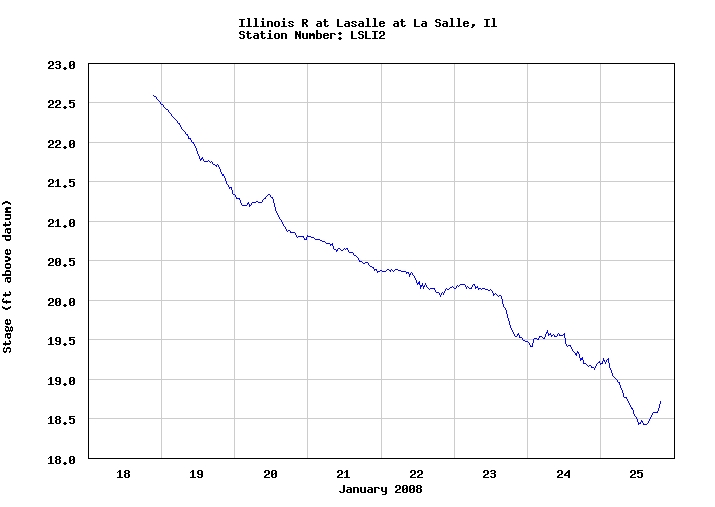 Member Posts: 617 Location: Oshkosh, Wisconsin | Rich - Here is a link to most (all?) of the stations on the Ill. River. Pick the Rock Island District, then the Illinois River basin, select the pool you want to look at, then pick what you want plotted. May want to play with a bit... http://www2.mvr.usace.army.mil/WaterControl/new/layout.cfm | ||