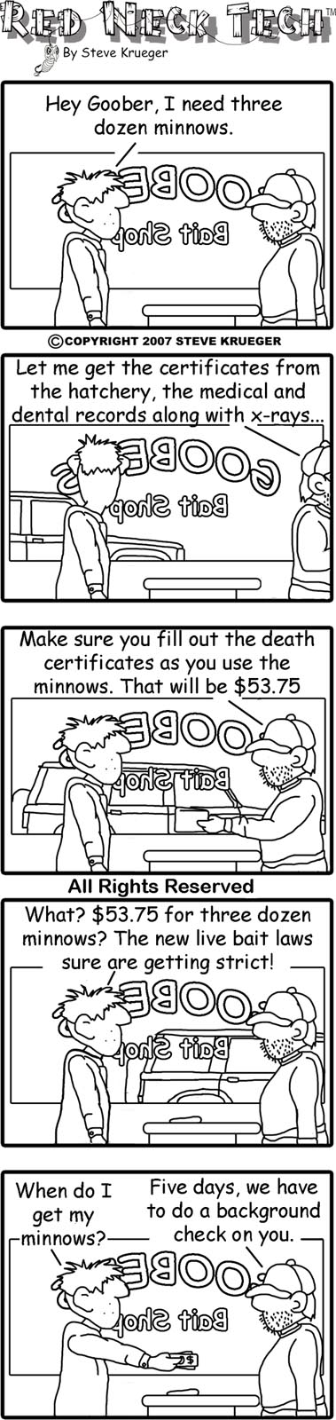 | Well, here is the first of the series of cartoons that will address the new bait laws in March. Hope you enjoy. |