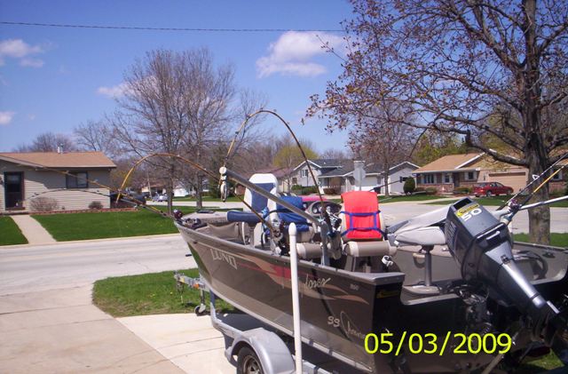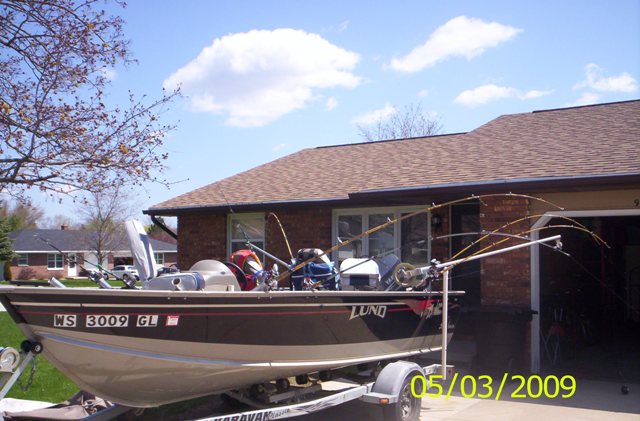 Member Posts: 32 Location: Green Bay | riggers are gonna be for salmon late summer, I've been runnin boards off the front which will also run dipseys, learning the bay has been a ton of fun, my heart was pounding in da waves dis mornin', den i got a fish and and was shaking like a drug addict...i'm so addicted.. i need help, right now the wind has layed down and i'm wishin i didn't hafta be at work early for a project, wifes about ready to kill me, i'm watchin the wind all the time and right now she's laid down , i should be trolling boards and harnesses....drat!! why'd i ever start this... i love it!! first time is free...then you pay lead core, cranks, harneeses, riggers, boards ...oh my!! Oh WEE -ooh! | ||