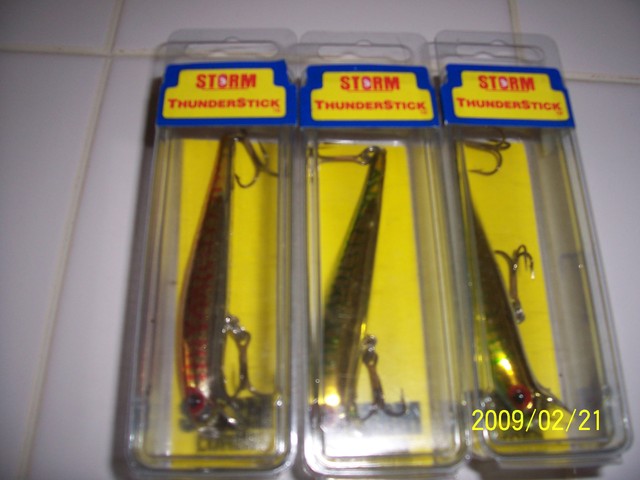 I have forty-two Baby Thunder Sticks, one Rapala custom painted, and three Thunder Stick Jrs. The Thunder Stick Jrs are new in the package. Fourteen of the Baby Thunder Sticks are custom painted. These are hard to find, as you probably know. Asking $300 and $10 for shipping. Or pick up for free. I will not break up the set, I am selling it as a lot. If I do not sell them, I will just put them back in my basement.