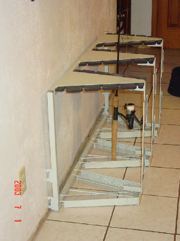 Member Posts: 29 | I have from a Wal-mart a floor mount rod rack that holds 30 rods and reels. The unit is approximate 3 feet wide and 2 feet deep. The unit really keeps all you rods and reels neat and tidy. I have 6 of them for sale and I am asking $25 each plus shipping. I can e-mail photos to anyone that is interested. Cranky | ||