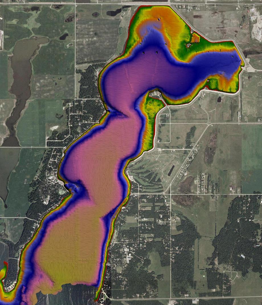 Member Posts: 213 Location: Forest Lake, MN | Used the Humminbird 997 wired to the laptop so I could watch DrDepth in the boat while I collected the data. I used Global Mapper to create this image. The nice thing about the Humminbird 997 running side scan is it lets me see any thing I might be missing. I ran 120 foot spacing on the lines of travel. Warren | ||