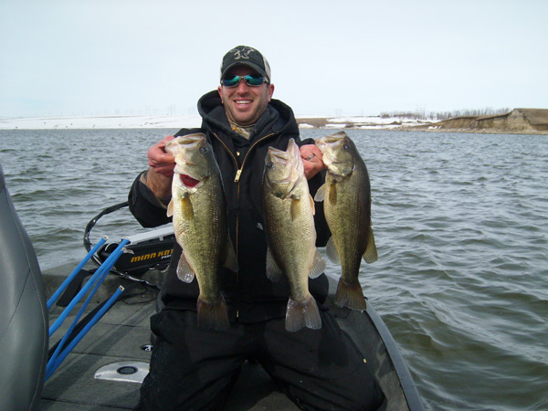 Don't have any updated rig pictures, but I do have pictures of the maiden voyage catch. Nothing beats snow on the ground and fishing a heated power plant lake in the middle of nowhere. Boat worked awesome. Stable like no other boat i've been in. The Fortrex pulled it around very easy. On 10 setting we got 3mph gps so you can make it move. The side image worked great without having to tweak it any. Room wise not bad considering it was the first trip out, we both had all our gear out even though we didn't need it all out (you all know how that goes). Anyways, the 3 biggest bass of the day came on jigs/chunks. Caught lots on cranks too. The fish spit up TONS of craws in the livewell so you know what they were keying on. My cousin is holding the 3 biggest fish of the day, nothing huge, but a heck of a lot better than waiting for the ice to clear the lake.