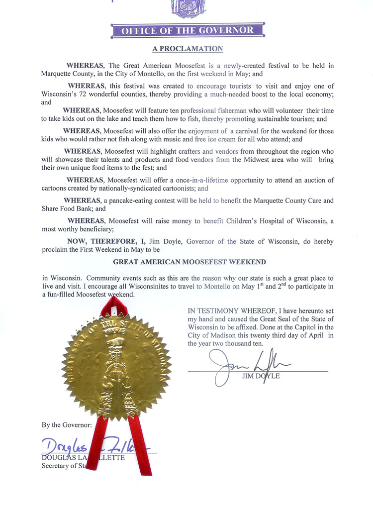Member Posts: 319 | For anyone that wants a giggle here is the proclamation Gov. Doyle signed about Moose Fest. The pro fishermen are mentioned on it also. Attachments ---------------- 001.jpg (184KB - 124 downloads) | ||