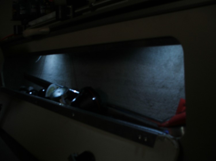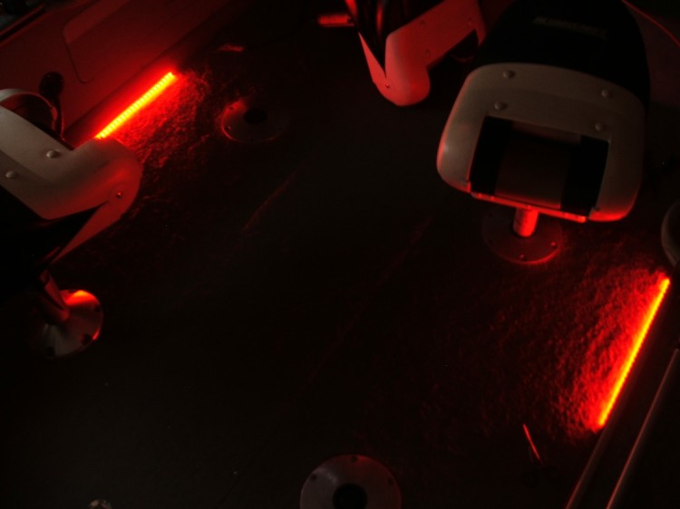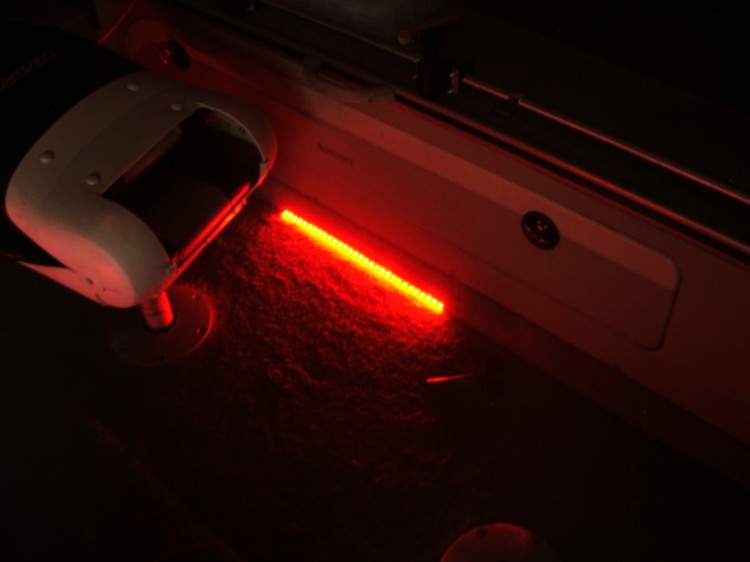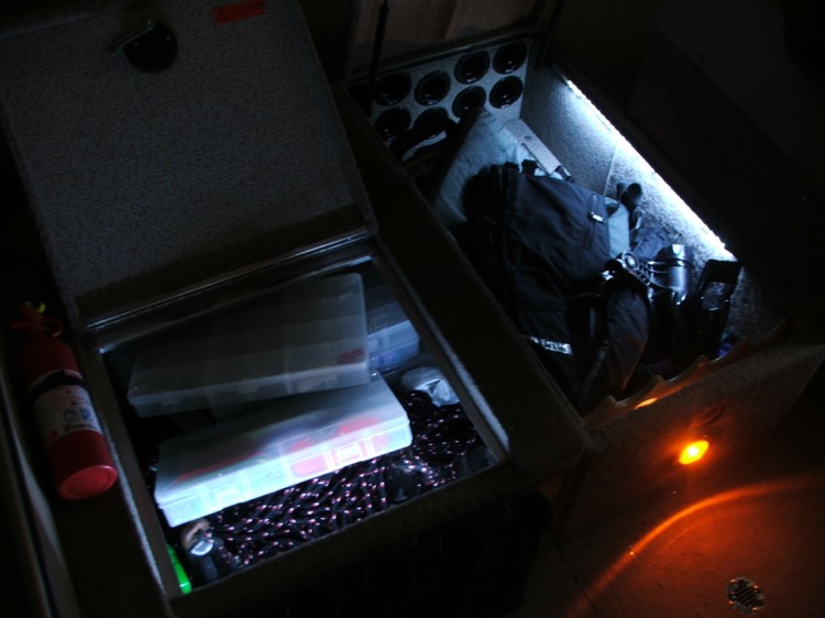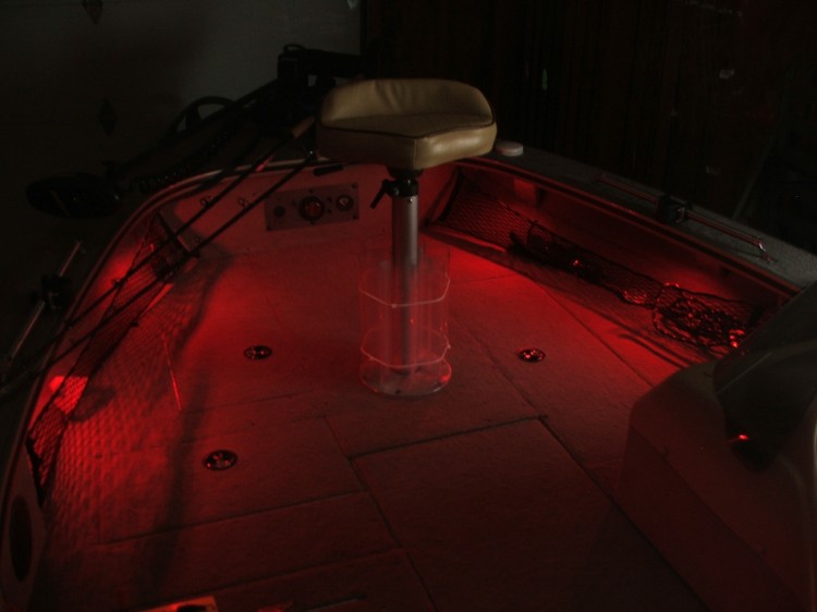 Finally got my boat done with some bluewaters. I used (4) red 4 led lights up on the bow. (2) red rod lockers lights inset by cutting away some of the carpet into the side so it' s flush for the back of the boat. I used the white 4 led lights for the small compartments and I used (2) white rod locker lights for my rod locker and compartment next to it. I think it turned out nice. I do alot of trolling at night and these red lights should work great. I wired all the red lights through my empty acc switch and the white compartment lights are all tapped into my existing compartment wiring.