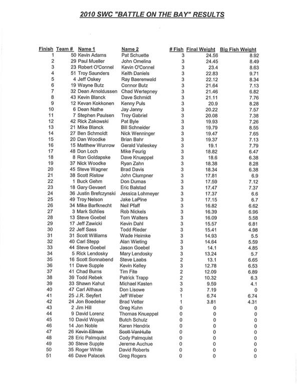 | Well, It sucks being on the bottom of the page, but I sure had fun. Even if I came in 45 minutes late due to no fish and knowing there was no reason to break the boat running in 4 to 7 footers. Congrats to my competitors and condolences to those who broke stuff. I enjoyed seeing my friends and competitors. The whole event was a class act I will probably fish again next year. Good job Sheboygan Walleye Club! David | |||