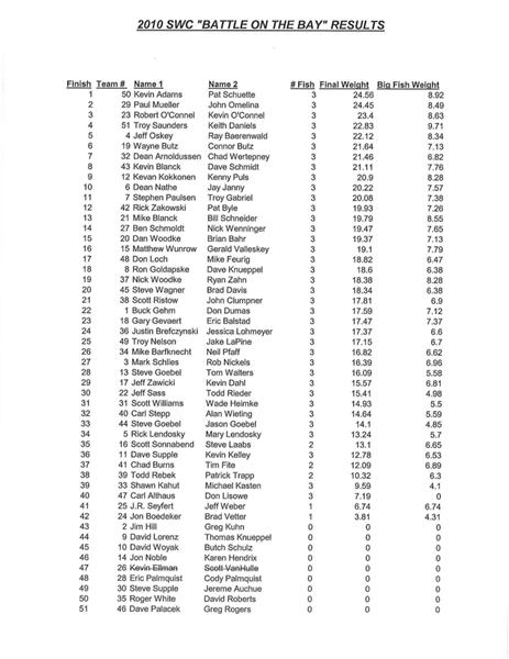 I was wondering the same thing when we weighed in. During rules meeting we were told there would be someone checking boats at one of those two areas. Got in the river, and saw nobody. Seems to me some of those weights may be a little different if all late boats were accounted for. 1 second late=loss of 1/2 your weight......