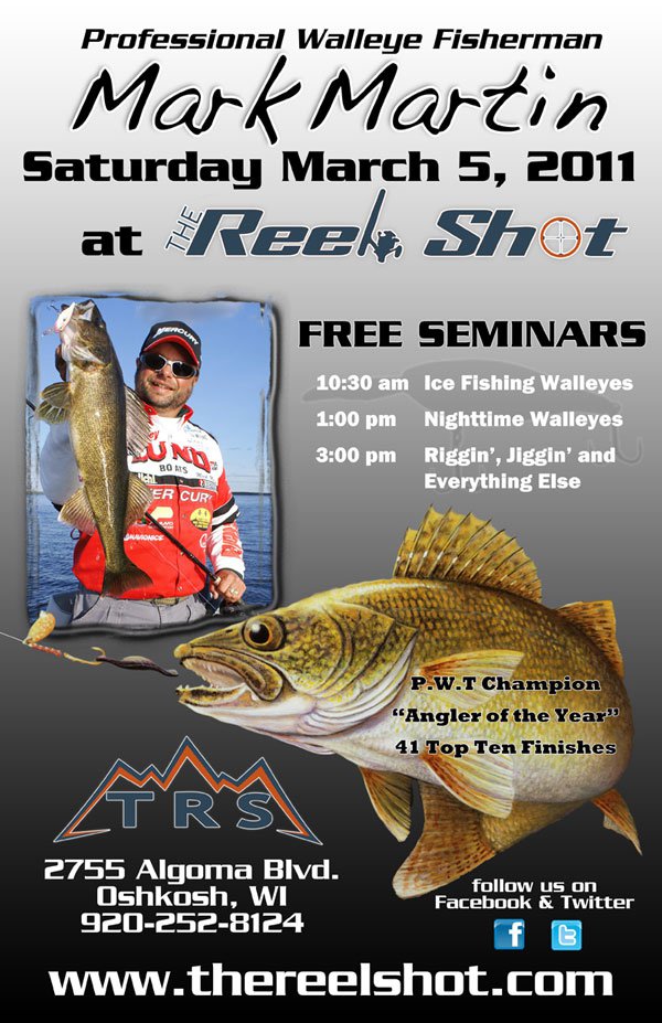 | Jump to page : 1 Now viewing page 1 [25 messages per page] Walleye Fishing -> General Discussion -> Mark Martin Seminars at The Reel Shot this Saturday, March 5 |