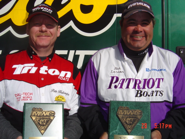 | Actually, the Saugers we caught the second, and final day of the MWC Lake Pepin Tournament were the sweet. The sour award goes to my MWC partner for the event - Pete Huibregtse - who had a very tough contest. And believe me, I suffered right alongside my veteran MWC partner! For starters, the cold winds that dominated our 5 days on Lake Pepin, made for miserable fishing conditions and discouraged the walleyes from grabbing our baits. This was reflected in our take of one legal walleye in 3 days of pre-fishing practice. Since we had no success during those 3 days, we fished what my good friend and former touring pro, Ralph Brunner, would describe as "fishing memories". My very sturdy veteran partner does have alot of these memories and this is where we were forced to draw our strategy from. The first day's catch of 2 "memory" fish - one caught vertical jigging and the other casting cranks to the shoreline - was good enough for us to claim the 61st position. This not only kept us in the game, but moved us up the championship standings from the outside position of 44th place to the inside one of 36th. That left just one more day of fishing to obtain our goal of making the championship! Nighttime found us talking at length planning our strategy for that final day of the contest. And we didn't talk much about catching walleyes. The conversation kept our fingers circling around and pointing to the area on the map Pete would call "the Sauger Sweet Spot". And that is where we spent most of the day trolling lead core line. Straight from the boat as it was important to the fish in keeping our clown shad raps and red wally divers pounding the bottom. Now I do need to descibe something a bit more personal about Pete than would normally want to do. He had a very sour day of fishing and wasn't much help to the cause. All day he fought with tangled lines as his short 7.5 foot rods just didn't have the reach like my 10 footers did. Couldn't even tell you how many times he had to deal with this, but it seemed like he didn't get much fishing in. But one thing that was certain through-out the day, Pete just furrowed that brow of his and never gave up. He would get to the job of fixing his rigs back up and fishing. Even at the last 10 minutes of the contest he set about untangling a line as if he could get that rod back in the water before we had to leave. As I busied in getting the boat readied for the speed ride back to check-in, that stubborn fool was holding the rod out the side of the boat and was letting the line out to fish those final 2 minutes. Really do think never say die is a good attitude, but for 2 minutes? When I heard him call for the net, it was my brow that furrowed. As I turned to react to this quip, his tense pose and clenched fists drew my gaze to a solid bend in that rod! And when the fish surged and took line from the reel, I snapped to attention like a private in the 3rd day of boot camp! Really was startled by that 3 pound Sauger as it popped from that muddy Mississippi water. As my eyes looked upon that fat fish laying on the floor of the boat, I realized for the second tournament in a row this lucky partner of mine pulled a money fish up with time expiring! This money fish, along with another fat sister and 2 nice walleyes, did win us an $800 payment for 25th place, and awarded us our goal of a spot on next year's MWC Championship Roster! Edited by Rick Larson 9/29/2003 5:53 PM Attachments ---------------- 25th.jpg (151KB - 191 downloads) BadWeather.jpg (136KB - 179 downloads) | |||
