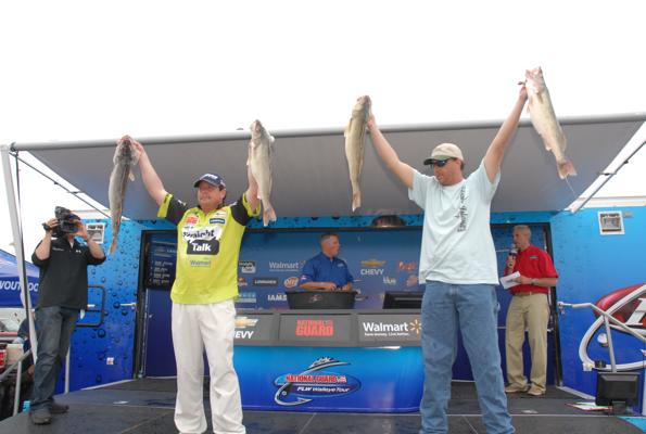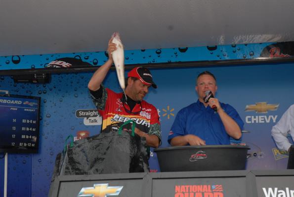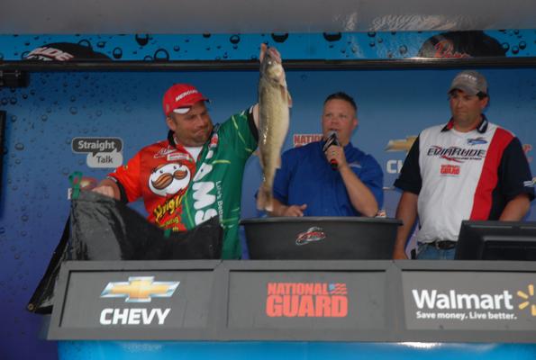 Member Posts: 34 | The final weigh-in was a surprise to some, but not for others. We did not see the biggest bags of the tournament, but we did see some impressive fish, emotional anglers, and an impressive victory by an FLW rookie. Jeff Graves claimed the top spot with a three-day total of over 115 lbs. This was his first FLW walleye tournament appearance, there is no better way to get things kicked off. "When I showed up at this event, I did not plan on winning," the 2011 FLW National Guard Lake Erie Champion said. "After Day-One, I knew I was on the winning fish and we managed to prove it on the first day. We experimented with a few bait presentations, but the dominating pattern was trolling reef runners over deeper water." The weather today was interesting. The rain and stormy weather held off, but a thick blanket of fog covered the region making boat travel slow and dangerous. Since the bite seemed to be encouraged by warming afternoon water temps, today's conditions threw a wrench in the works for a few of the top 10 anglers. Keith Kavajecz , new comer to the FLW, managed only two fish for just over eight lbs. As the final bag was weighed, the rain that was promised all week long finally began to fall. Jeff Graves weighed in his fish and celebrated as he held his trophy and $50,000 check up in the air. "It was an emotional finish for me," Graves stated. "I had the support of my family and the best wishes from several of my fishing buddies from back home. I wouldn't be here today if it weren't for their encouragement and belief in me." Tom Keenan took second and a check for $22,500.00 including contingencies. Danny Steffenss took third, John Balla fourth, Shawn Ritchie fifth, Scott Geitgey sixth, Mark Brumbaugh seventh, Keith Kavajecz eighth, Jeff Vereeke ninth, and Mark Gwizdala tenth. Today's top three were separated by ounces. FLW Coverage is brought to you by the JJ Keller Fishing Team/The Reel Shot! Attachments ---------------- Anthem.jpg (30KB - 178 downloads) Weigh-in crowd.jpg (35KB - 187 downloads) Weigh-in.jpg (46KB - 186 downloads) Chevy.jpg (27KB - 194 downloads) Brumbaugh.jpg (30KB - 190 downloads) gtx.jpg (31KB - 190 downloads) Kavajecz.jpg (29KB - 184 downloads) Mt Dew Shaking hands.jpg (27KB - 178 downloads) Pringles 1.jpg (31KB - 171 downloads) Ritchie and partner.jpg (30KB - 177 downloads) Ritchie Fist Pump.jpg (28KB - 180 downloads) Steffens an Partner.jpg (33KB - 167 downloads) Steffens Celebrating.jpg (24KB - 167 downloads) Graves and Fish.jpg (32KB - 156 downloads) Graves check & Fish.jpg (27KB - 159 downloads) Grave & Check Held High.jpg (30KB - 166 downloads) | ||