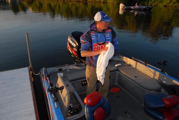 Member Posts: 34 | The final day of the FLW Leech Lake event got underway on time and under a beautiful clear sky. The wind was almost flat and that is actually the forecast for the bulk of the day. Even with yet a different weather pattern, the water temps have remained stable and the fish the top ten anglers are on should still be catchable. Spirits were high and anticipations growing as the final day's blast off came and went. "I have been fishing relatively deeper than most guys," says Mercury Pro, Tommy Kemos who left the dock this morning in 5th place. "Its a tight race and it is really anybody's tournament to take home. I expect to find the fish where I have been finding them on a daily basis, my shorts come early and my overs have been typically coming during the afternoon. It will be a tight race and very interesting to watch it unfold this afternoon." With the National Guard teams consisting of Shimota and Courts holding down the 2nd and 3rd spots respectively, it will be a win/win for the National Guard Team. Both are wishing the other well, but hoping they have the better bite as they are there to win. "If the guys are on the same fish they have been catching and can manage to put a limit in the boat, its going to remain tight for the finish," explains Bill Shimota, currently in 2nd place after day two. "I am confident my pattern will hold and that the fish will eat, its just a matter of the right fish. To win, you will have to have two solid overs and a healthy collection of unders, or you just flat won't win. A certain amount of luck in involved there, but these guys are the best in the world and will find fish today." Its a tight race, with less than ten pounds separating 1st from 10th. It is really anybody's tourney at this point. Top Ten- Kevin Carstensen - 29-00 Bill Shimota - 27-11 Mark Courts - 26-13 Rick Olson - 24-02 Tom Kemos - 23-04 Paul Meleen - 21-10 Mark Christianson - 21-00 David Bjorkman - 20-11 Scott Larson - 20-11 Eric Olson - 20-07 The final weigh in will take place just up the road at the Northern Lights Casino at 3:30 PM. Tournament coverage brought to you by: Lund Boats and The Reel Shot/JJ Keller Fishing Team, and Mercury Marine. Attachments ---------------- Backing in.jpg (39KB - 205 downloads) Blsat off.jpg (26KB - 214 downloads) Getting wired.jpg (35KB - 199 downloads) Going.jpg (50KB - 196 downloads) Gone.jpg (19KB - 205 downloads) Gone gone.jpg (15KB - 189 downloads) Graph.jpg (38KB - 183 downloads) Lund Rig.jpg (33KB - 187 downloads) Morning interview with Kemos.jpg (49KB - 203 downloads) Pre BLast off sun.jpg (21KB - 184 downloads) Shimota getting ready.jpg (34KB - 167 downloads) Telling Lies.jpg (33KB - 194 downloads) Unhooking.jpg (40KB - 184 downloads) | ||