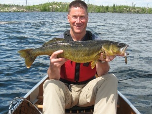| Great looking fish from a canoe. wondering about the dead trees in the background, old fire damage? storm? ice? |