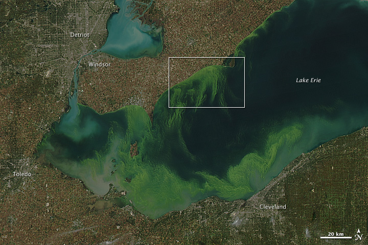 Member Posts: 1314 Location: Menasha, WI | I saw this elsewhere but thought it fit well with this discussion: The green scum shown in this image is the worst algae bloom Lake Erie has experienced in decades. Such blooms were common in the lake’s shallow western basin in the 1950s and 60s. Phosphorus from farms, sewage, and industry fertilized the waters so that huge algae blooms developed year after year. The blooms subsided a bit starting in the 1970s, when regulations and improvements in agriculture and sewage treatment limited the amount of phosphorus that reached the lake. But in 2011, a giant bloom spread across the western basin once again. The reasons for the bloom are complex, but may be related to a rainy spring and invasive mussels. The Landsat-5 satellite acquired the top image on October 5, 2011. Vibrant green filaments extend out from the northern shore. The bloom is primarily microcystis aeruginosa, an algae that is toxic to mammals, according to the Great Lakes Environmental Research Laboratory. Several days of calm winds and warm temperatures allowed the algae to gather on the surface. The bloom intensified after October 5, and by October 9—when the Moderate Resolution Imaging Spectroradiometer (MODIS) on the Aqua satellite acquired the lower image—the bloom covered much of the western basin.