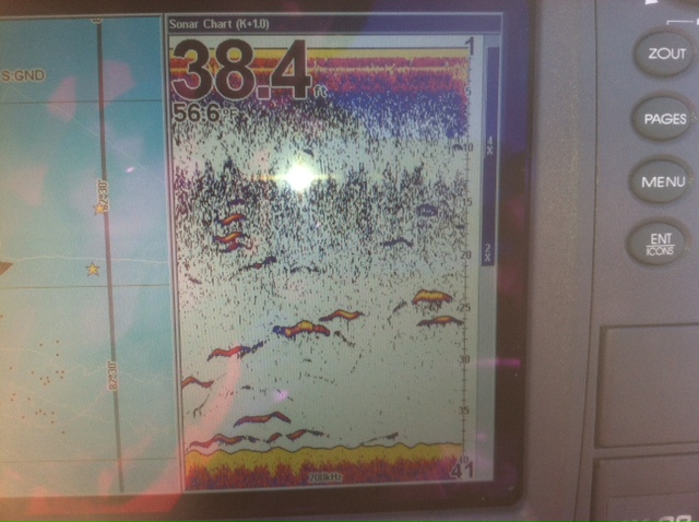 I ran into the same deal here a few weeks back. sonar lit up, fish deep wouldn't hit. lottsa fish. maybe they were fallfish, whitefish, lake trout, don't know. I moved shallow found some biting. I wanna hit up there next year mark, I'll be in touch for info.