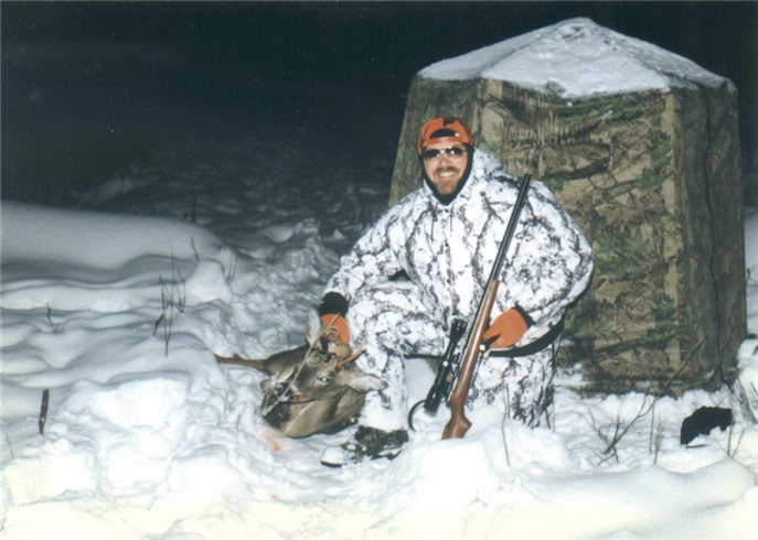 Member Posts: 526 Location: blue mounds,wisc | i sent a whopper of a doe into a tumble saturday. she made the mistake of coming twenty two paces into my shooting lane and was blasted by my black diamond.she was blown over feet into the air over her back and was done. what a powerfull weapon. now i will have some jerkey. the loins are going on the grill at half time!! | ||