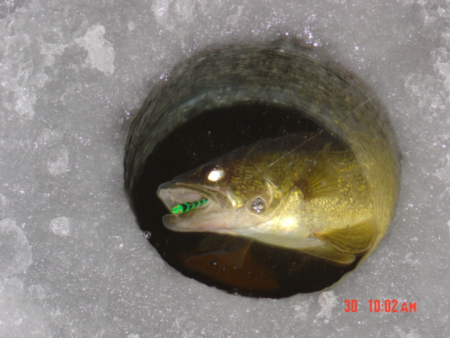 Member Posts: 103 Location: Collins, WI | Congrats on all the nice fish you guys caught. That picture with the fish in the hole is beautiful. So, it was a 10 O'Clock bite eh? That glow tiger rapala catches a lot of fish out there. Good to hear the walleyes are still cooperative. Thanks for report, Trap | ||