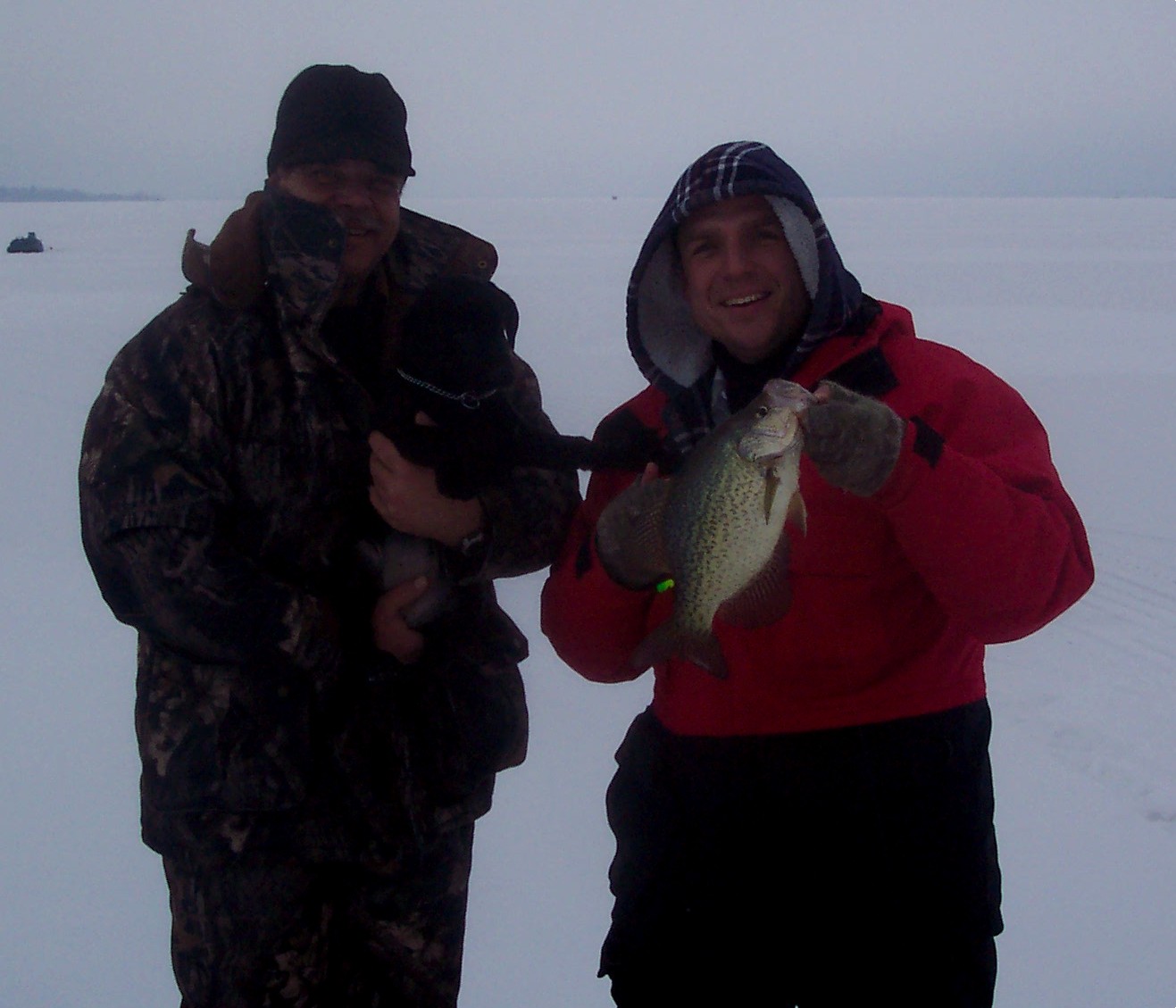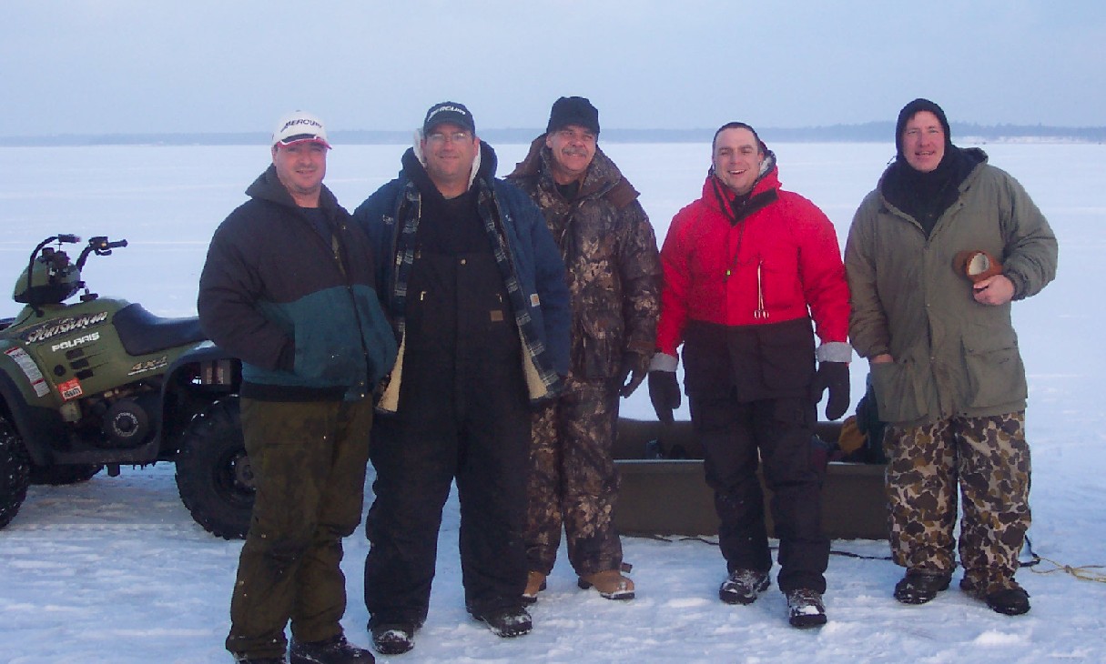 Greg got a 17" walleye and Theedz got a 14.5" Crappie a short time later. After a lunch of John's chilli, and Grag's venison samiches, we settled back to watch our tipups. Several more short eyes, and 2 more nice Crappies by Theedz were iced. Around 4:00 PM, we called it a day, took some group picturs, and headed for the Park. Upon arriving at the access, we were greeted by a family trying to free their Jeep, which was hung on the frame on the heave ice. Completely blocking our exit, we tryed to help push them out, but no go. Theedz and Sluggo took their sleds around, and headed for home. Larry and I headed a couple miles north to the next access, while John and Grag drove our trucks to meet us. I'll bet there were a bunch of PO's fisherman at Monroe Park later. We loaded up, said our goodbyes, and were on the road home. I ended up with the fish we kept, and we fried them up at the M-I-L's house that same night. They were excellent.