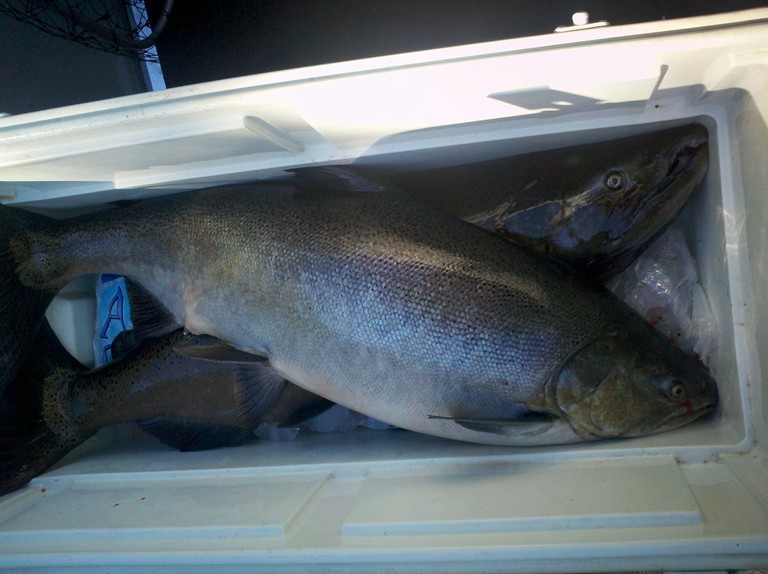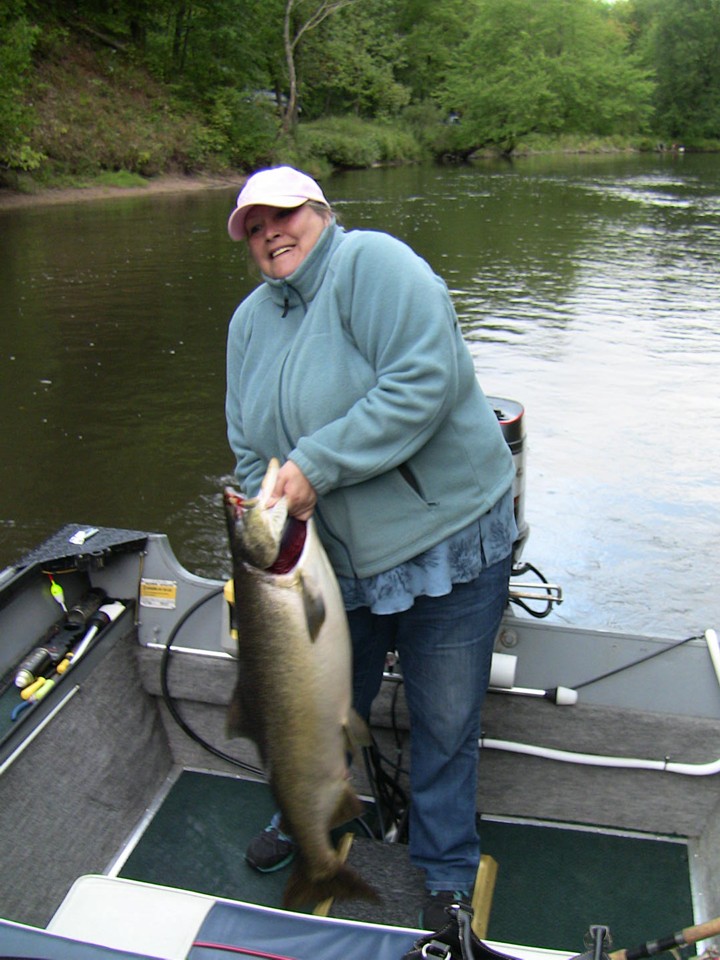 ![]() Member Posts: 2680 Location: Essexville, MI./Saginaw Bay. | Thanks Mark. Glad we were not in the Kayaks today. The girlfriend caught her first Salmon today and it was a massive girthed monster. She casted, hooked and landed the beast with only (sometimes loud) verbal support from me. Even after she begged me to take the rod maybe 15 minutes into the fight. This HUGE 27 pound Female took almost all her line off the reel until I reached over Marys shoulder and tightened the drag to the tensel strength I thought for sure was either going to end with a break off or straightened the hooks on the crankbait. But it turned the fish and she pumped it back to the boat like a real trooper. I then fallowed with a Monster of my own. A big male about a pound or two smaller then hers. Then I broke off 3 more Dandys before 10:00am using bobbers and spawn while fishing to close to an old rush pile that I've taken many salmon from over the years. But these fish this year are pizzed off brutes for sure. Attachments ---------------- Friday the 13th 002.JPG (109KB - 237 downloads) Friday the 13th 003.JPG (167KB - 254 downloads) Resampled_2013-09-13_10-54-14_707.jpg (96KB - 242 downloads) | ||