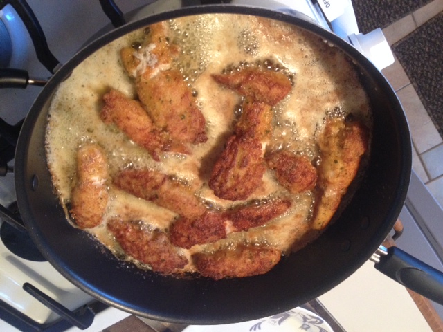 I dredged the squid and walleye after they were stuffed into an egg & Milk wash, then into my magic batter for the coating. I use a 1/2 Frying Magic & 1/2 Italian Bread Crumb batter. I add some parsley flakes and Garlic powder to the batter as well. I fried them in a Virgin Olive Oil and Butter mixture. Did some oven french fries and ate myself into a couch comma.