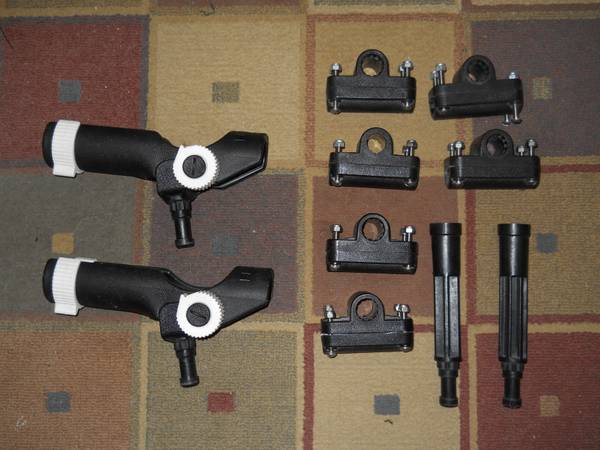 I have (2) FISH-ON Rod Holders with (6) mounts that include the Rails adapters as seen in pic! These mounts include all the Stainless mounting screws and lock nuts. Also included are (2) extensions. This total package would cost over $130 plus tax NEW. These are like new all in workable order! These are made better than the newer ones on the market today! Asking $90tyd O.B.O