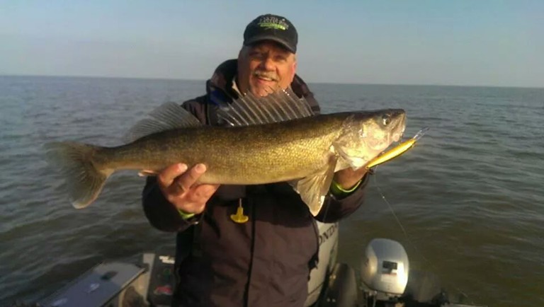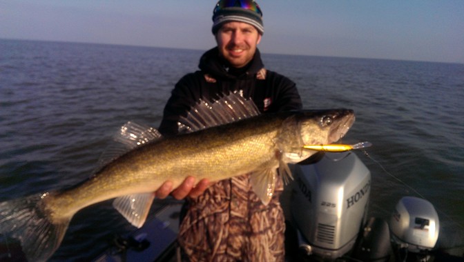 Location: Essexville, MI./Saginaw Bay. | The Walleye inland lakes and rivers season opens today 4-26-14 in Michigan, but a lot of these systems farther north are still ice covered. And the ones that are not have mostly the smaller males left in their systems, who stick around long after the bar closes to sweep any girls left off their feet/fins. With a lot of years behind us catching many, many sub legal walleyes along with the keepers, our fishery is starting to produce some impressive average catches now. This big average size happened before back in the mid to late 80's when walleyes main forage was Alewife. The growth rates of Saginaw Bay walleyes back then were accelerated far and above anything else seen on the Great Lakes. This also came with a price, that our walleyes also seemed to die at an earlier age. Being to fat seems to be detrimental in all species. The newer forage base that replaced the Alewife after their collapse, seems to have leveled out the growth rates of our walleyes. So things are now what I'd say are status-quo in our fishery, with a good spread of all ages and sizes across the board. Here's a couple of dandy's caught along with smaller others on the Bay Friday/yesterday, the day before the inland opener. Both were released.