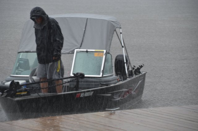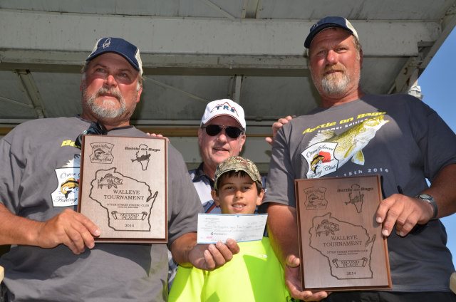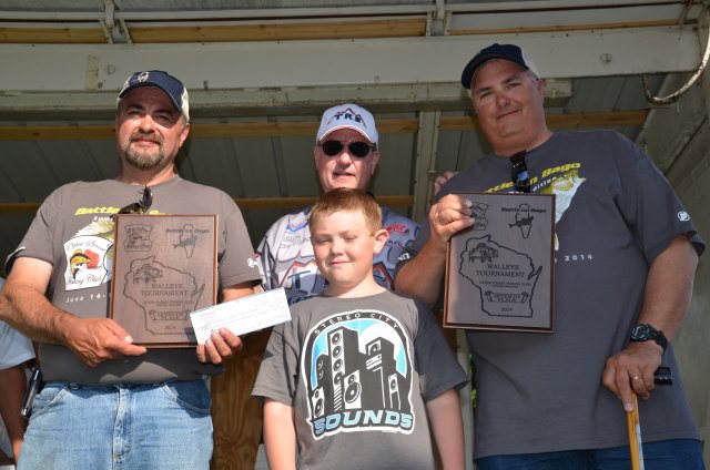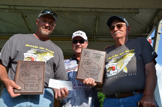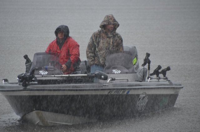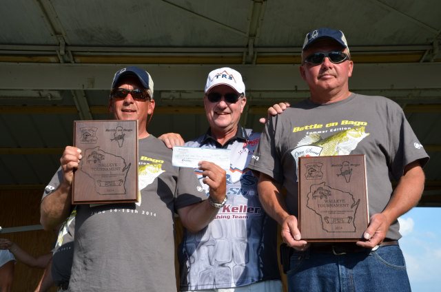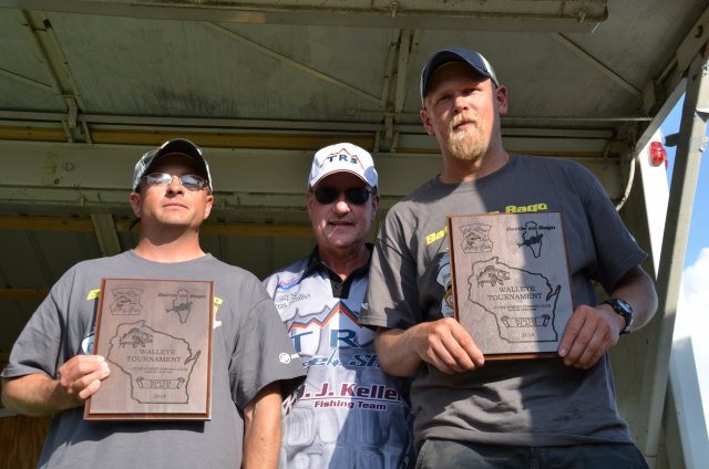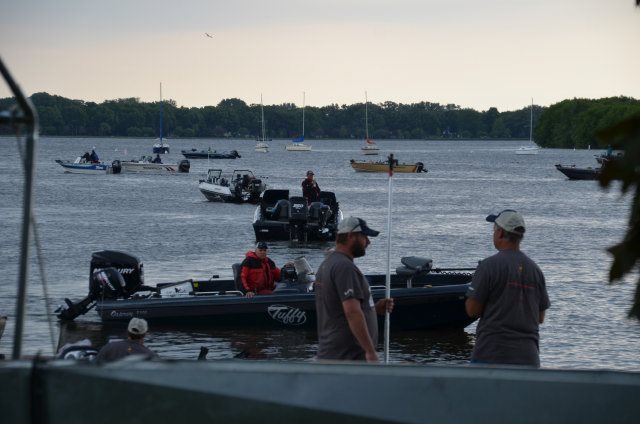 Location: Rhinelander | To say Winnebago was rough today would just plain be understatement. Boats were broken, gear was smashed, and anglers beat up, but the scales were very busy. As the weigh in progressed, it was clear the bite was slower today, but was still 'on' and the teams got into the fish pretty well, many at the expense of gear and body. The worst of the area storms missed the weigh in, but a frog strangler did blast the stage and dock for about 10 minutes, soaking the anglers and the fans. There was a GREAT crowd in attendance. Techniques were quintessential Winnebago with no surprises. Much of the big lake was just plain tough today due to high winds, so the Upper Lakes and River produced a number of the fish, but there were still a number of teams reporting they caught their fish on Winnebago today. Pictured are the top ten teams.