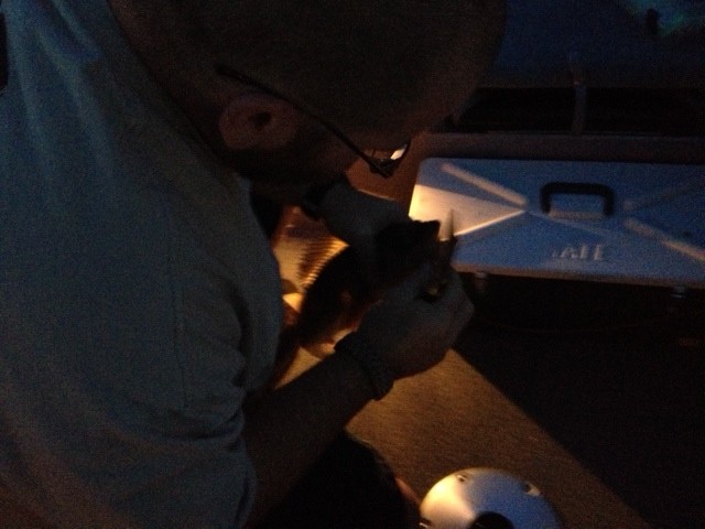 Brian started out like a pro, but when he swung one 23 incher in like a perch, I wondered about his understanding of small ones. But the lesson was learned after he banged a good fish into the back of the motor and it fell back in. We then moved to do some isolated, single rod pump trolling. That's where I shined and caught a couple myself. All in all we went 9 for 10. Launched at 9:00pm and back home by 12:30am. I took a lot more pictures even a couple of all the fish in the cooler. But dumb azz me, had the flash on my cell phone turned off. You can see the sprung/released inside planer board of the second walleye dragging in the water in the picture below. It struck as I was taking a picture of Brians first.