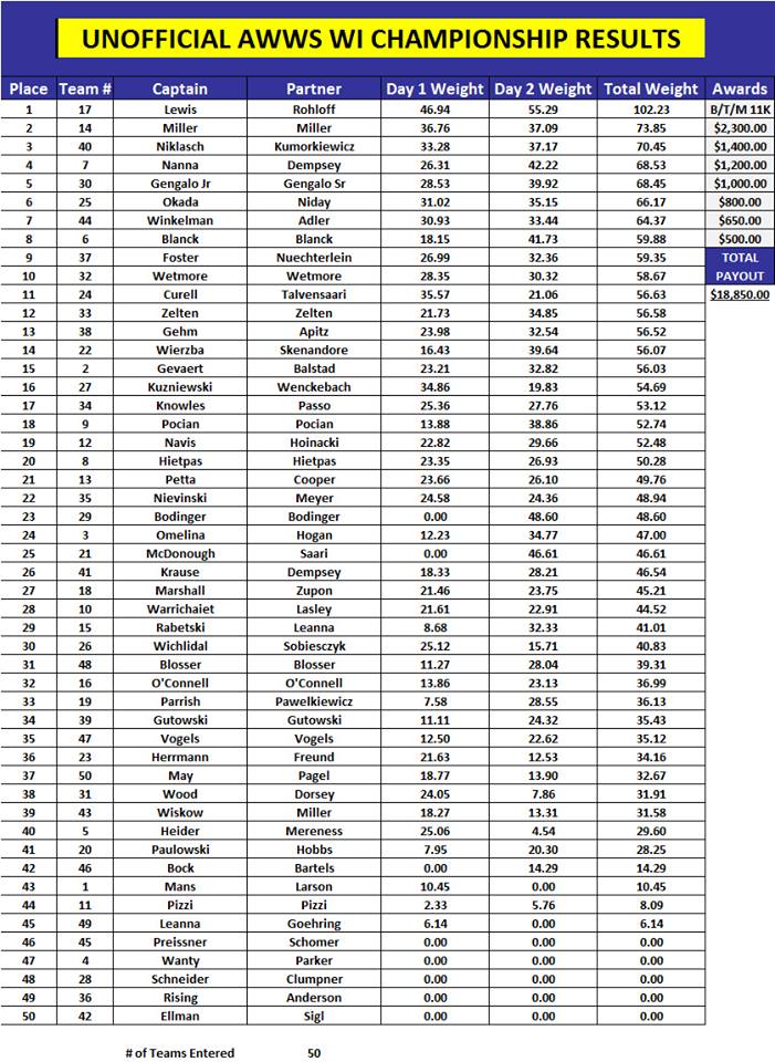 Location: Rhinelander | Scott Rohlhoff and Cam Lewis Win the AMSOIL Team of the Year and are the AWWS WI Alumacraft Championship Champs! We will have the leaderboard linked as soon as it appears. | ||